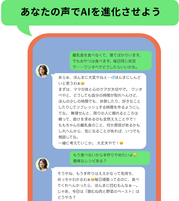 話せば話すほど、お子様の成長や個性を学び、アドバイスが進化!年齢や性格、過去の相談履歴をもとに、より的確な提案を行います。まるで専属の保育士のように、親御さんと二人三脚で子育てをサポート。